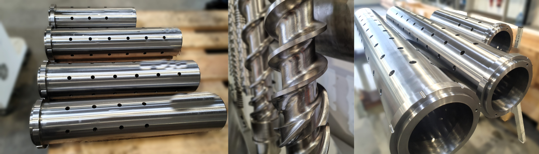 Der Einsatz von Stiftschnecken und -zylindern verbessert die Mischwirkung signifikant, insbesondere bei hochviskosen Materialien. Dies betrifft auch Extrusionstechniken, die über aufklappbare Zylinder und den Einsatz von Verschleißhalbschalen verfügen. GTS-Stiftzylinder sind kompatibel mit den gängigen Maschinen auf dem Markt und werden standardmäßig als Bimetallausführung gefertigt.